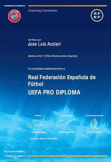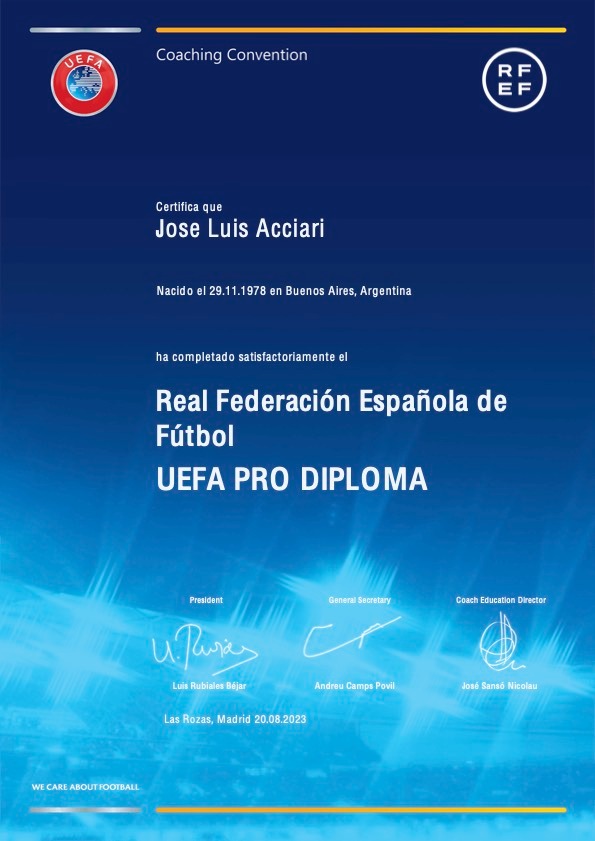 José Luis Acciari ostenta con orgullo la prestigiosa Licencia UEFA Pro, la certificación más alta disponible en el fútbol europeo.